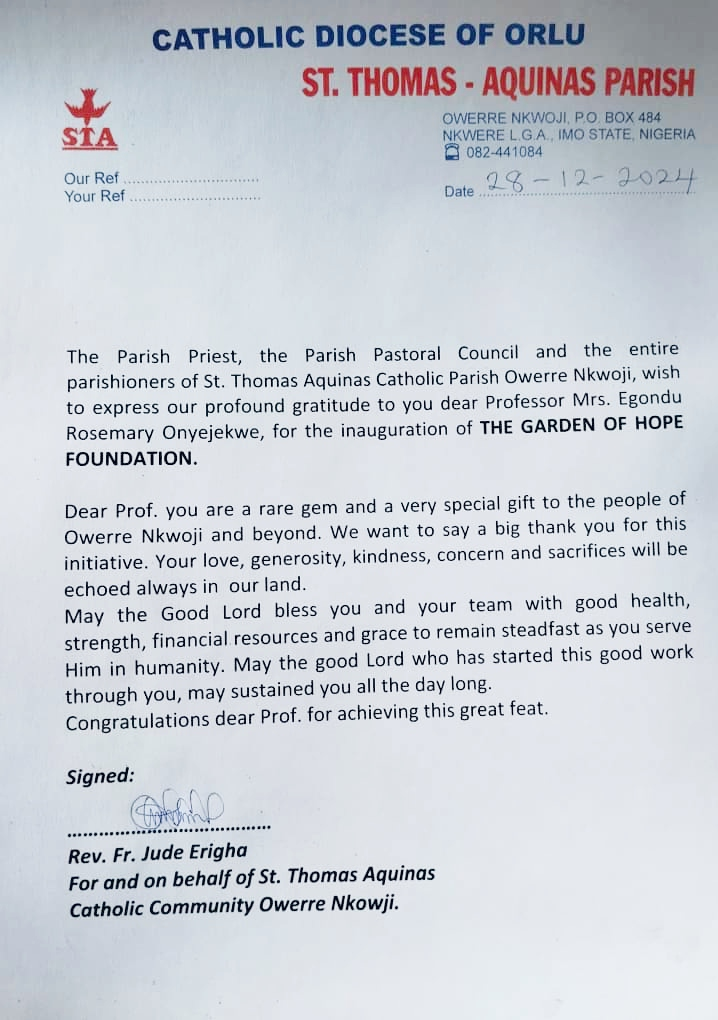 The Owerre-Nkwoji community expresses heartfelt appreciation to Nze Emmanuel Chidi Ezirim and the Garden of Hope Foundation for their unwavering commitment to improving the health and well-being of our people.