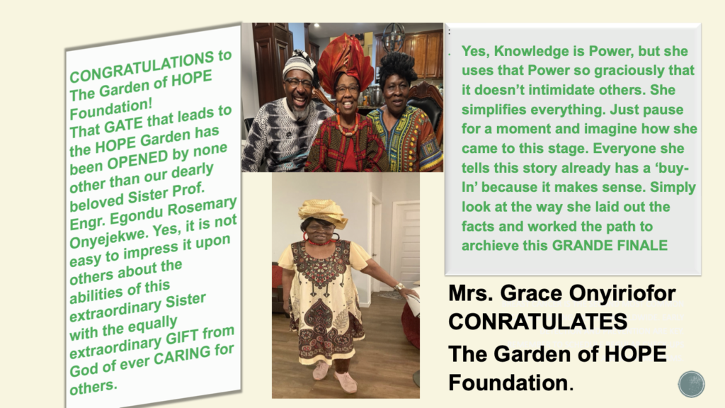 The Ishigbo of Owerre Nkwoji Community, HRH Eze Boniface Chukwukemeka Unogu, HRM Ugoeze Comfort Unogu, the Traditional Ruling Council, and the entire Owerre Nkwoji Community offer our heartfelt congratulations to Professor Egondu Rosemary Onyejekwe, Founder and President of the Garden of HOPE Foundation, and to all members of the Foundation on the groundbreaking ceremony for your new project. We are delighted to welcome this initiative to our community and wish you every success. May good things continue to flourish in Owerre Nkwoji.